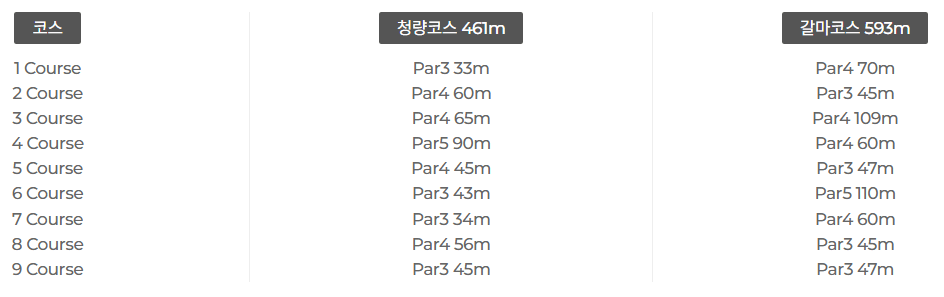 청량산 파크골프장은 울창한 숲과 계곡이 어우러진 천혜의 자연 환경 속에 조성되어 있어요. 총 9개 코스가 461m의 청량코스와 593m의 갈마코스로 나누어져 있어요.