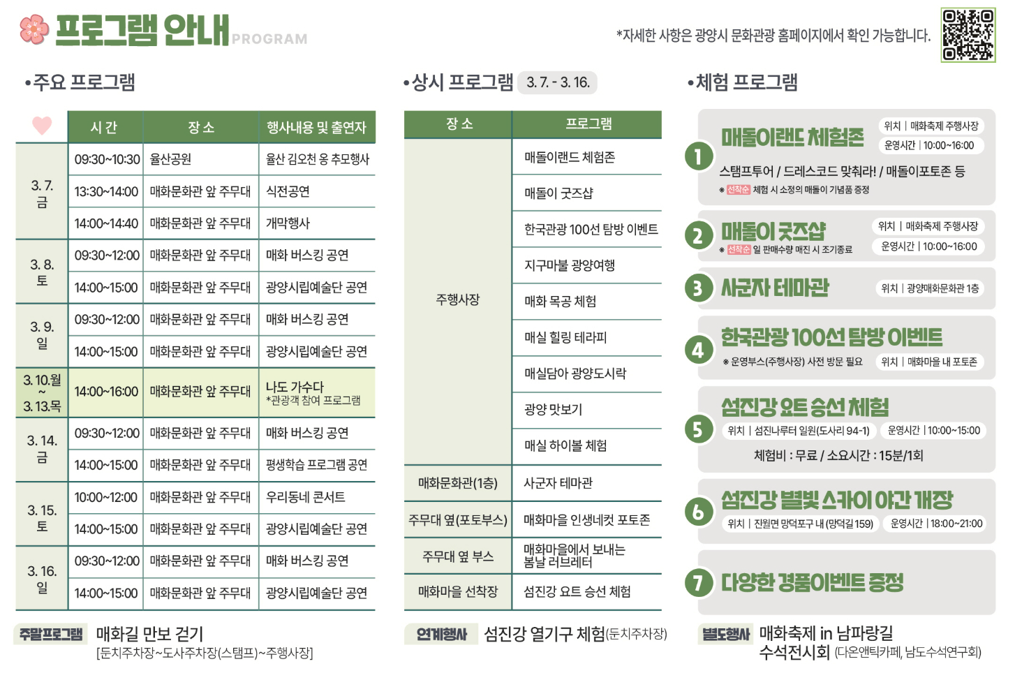 사군자 테마관 운영, 매실 하이볼 체험, 인셍네컷 포토존, 버스킹 등 매일 일정에 따라 다양한 프로그램이 진행되니 축제장에서 함께 즐겨보시기 바랍니다.