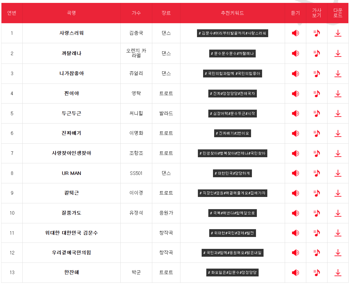 아래 링크는 국민의 힘 공식 로고송 홈페이지로 연결되어 있어요. 빠르게 이동하셔서 로고송 리스트를 확인하시고 직접 들어보세요.