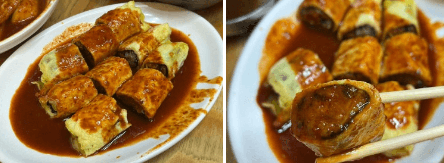 | 노란밥 | 계란찜처럼 부드러운 계란지단에 돌돌 말아 내어주는 미니 김밥입니다. |