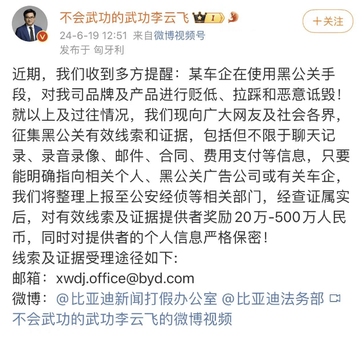 BYD 브랜드의 홍보 총책임자인 리윈페이는 2024년 6월 19일에 자사 소셜미디어를 통해 악성 루머 제보 방법을 아래와 같이 공지하였습니다.